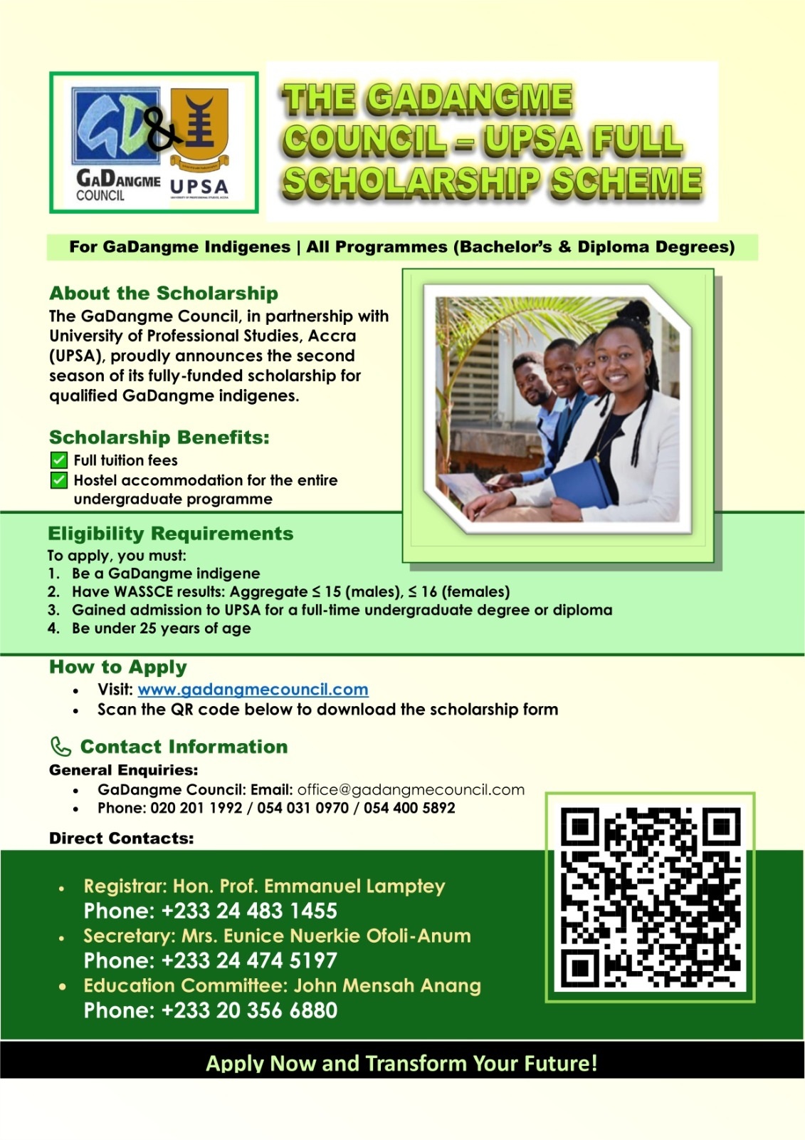 The GaDangme Council is delighted to announce the second badge of the GaDangme Council–UPSA Scholarship Scheme, dedicated to supporting bright but financially disadvantaged GaDangme students who have recently completed Senior High School. Through our strategic partnership with the University of Professional Studies, Accra (UPSA), this initiative offers deserving young SHS scholars the opportunity to pursue quality tertiary education and unlock their full potential. This scholarship reflects our commitment to empowering the next generation, nurturing GaDangme talent, and promoting long-term prosperity within our communities.
